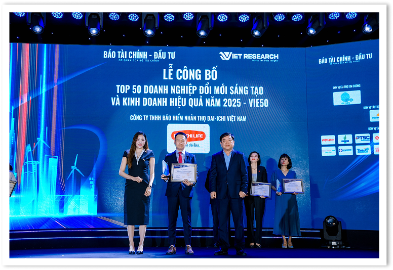 Ngày 27/6/2025, Dai-ichi Life Việt Nam đã được vinh danh cùng lúc ba giải thưởng uy tín: Top 50 Doanh nghiệp Đổi mới Sáng tạo và Kinh doanh hiệu quả (VIE50), Top 100 Doanh nghiệp ESG Việt Nam Xanh (ESG100) và Top 10 Doanh nghiệp ESG Việt Nam Xanh – Ngành Bảo hiểm (ESG10) tại Diễn đàn Vietnam Summit 2025 - “Đổi mới sáng tạo - Kiến tạo tương lai bền vững”, do Báo Tài chính - Đầu tư (Bộ Tài chính) phối hợp Viet Research tổ chức tại Khách sạn Pullman, Hà Nội.