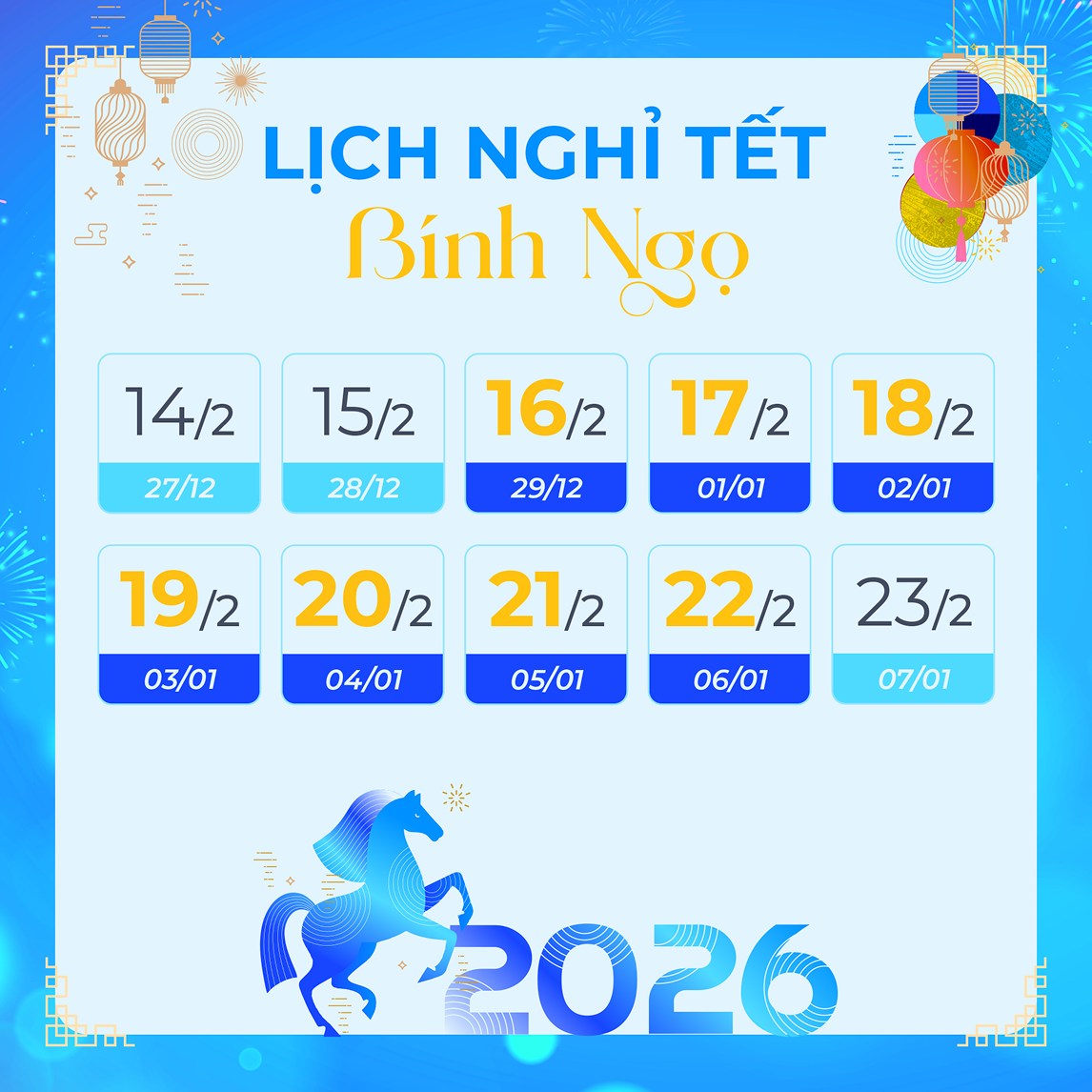 Dai-ichi Life Việt Nam sẽ nghỉ lễ từ ngày 16/2/2026 đến hết ngày 22/2/2026, và sẽ hoạt động trở lại vào ngày 23/2/2026 (tức mùng 7 Tết). Trong thời gian này, các giao dịch trực tuyến vẫn hoạt động bình thường.