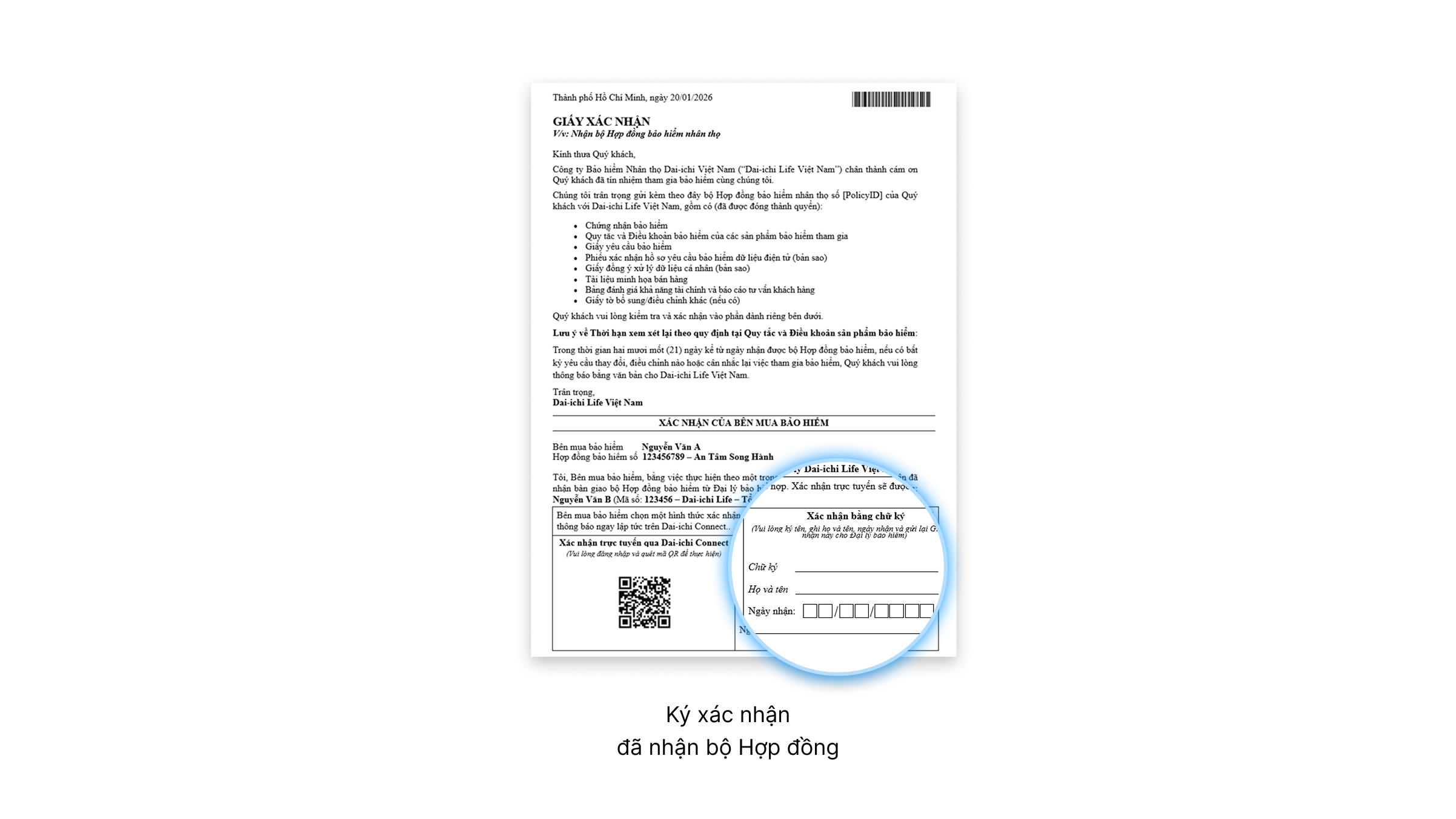 Xác nhận đã nhận bộ Hợp đồng bảo hiểm giấy từ Đại lý bảo hiểm của Dai-ichi Life Việt Nam là thủ tục quan trọng giúp Công ty ghi nhận thông tin đầy đủ và đảm bảo quyền lợi cho Quý khách trong suốt quá trình tham gia.