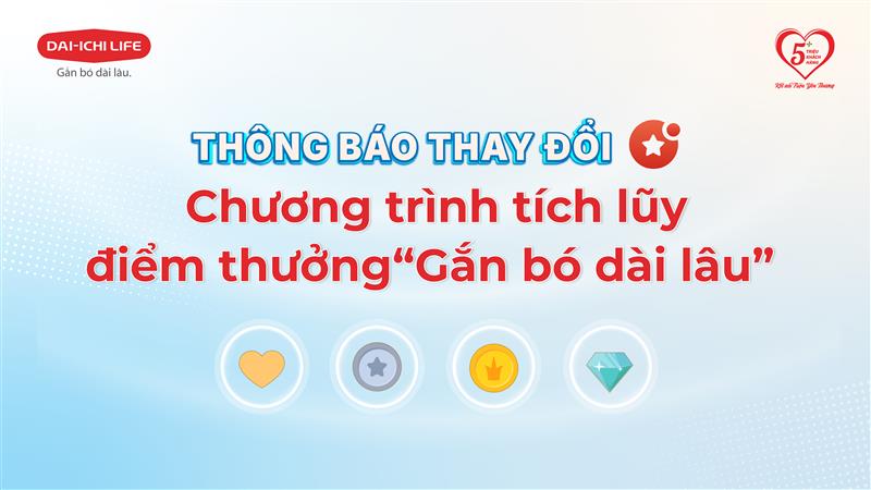 Công ty TNHH Bảo hiểm Nhân thọ Dai-ichi Việt Nam (Dai-ichi Life Việt Nam) trân trọng thông báo: từ ngày 24/09/2025, chúng tôi sẽ chấm dứt Chương trình hiện tại có tên gọi là Chương trình tích lũy điểm thưởng “Gắn bó dài lâu” và triển khai chương trình mới với tên gọi Chương trình Tặng điểm “Gắn bó dài lâu” (*) kể từ ngày 24/09/2025 đến ngày 26/07/2029.