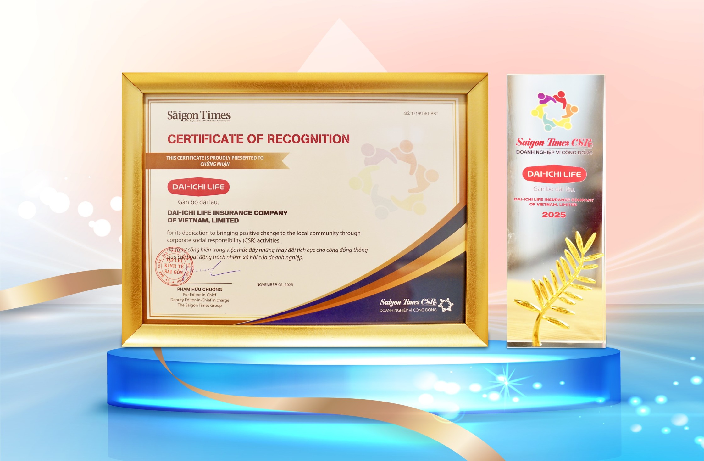Dai-ichi Life Việt Nam vinh dự đạt danh hiệu “Doanh nghiệp Vì Cộng đồng - Saigon Times CSR 2025” lần thứ 7 liên tiếp (2019 – 2025) trong Lễ “Tôn vinh Các Doanh nghiệp Vì Cộng đồng - Saigon Times CSR 2025”, do Tạp chí Kinh tế Sài Gòn tổ chức tại Gem Center, TP. Hồ Chí Minh.
