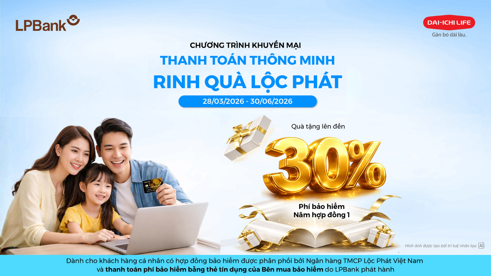 Với mong muốn đồng hành cùng khách hàng trong việc xây dựng kế hoạch tài chính dài hạn và gia tăng bảo vệ cho bản thân và gia đình, Dai-ichi Life Việt Nam phối hợp cùng Ngân hàng TMCP Lộc Phát Việt Nam (LPBank) triển khai chương trình khuyến mại “Thanh Toán Thông Minh - Rinh Quà Lộc Phát - Năm Hợp Đồng 1” trên toàn quốc.