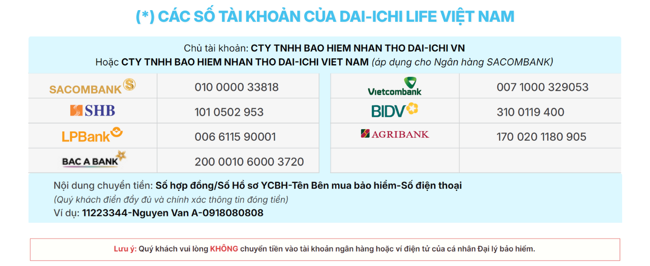 - Chi nhánh/Phòng giao dịch ngân hàng nộp tiền mặt/chuyển khoản bằng Ủy nhiệm chi vào tài khoản Dai-ichi Life Việt Nam (*)