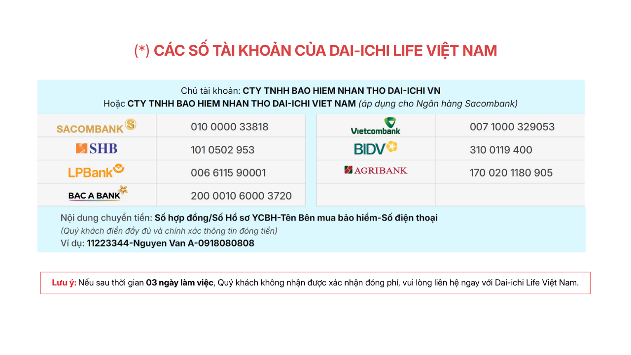 *Lưu ý: Nếu sau thời gian 03 ngày làm việc, Quý khách không nhận được xác nhận đóng phí, vui lòng liên hệ ngay với Dai-ichi Life Việt Nam.